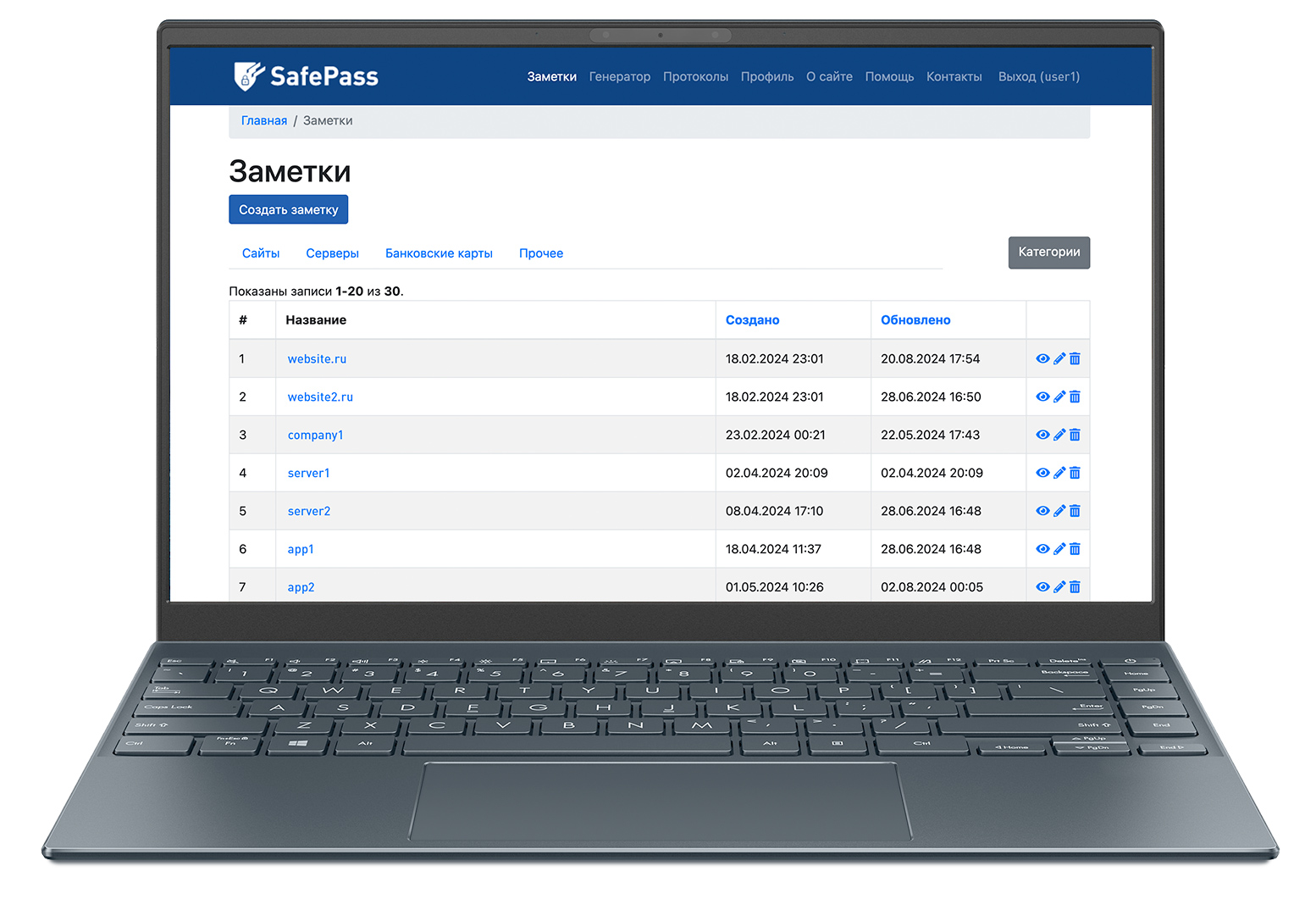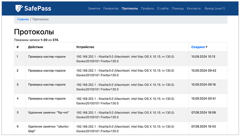 Ведется протоколирование всех действий — от входа в аккаунт и проверки мастер-пароля до удаления всех заметок или очистки сессии. Протоколы удалить или очистить невозможно.