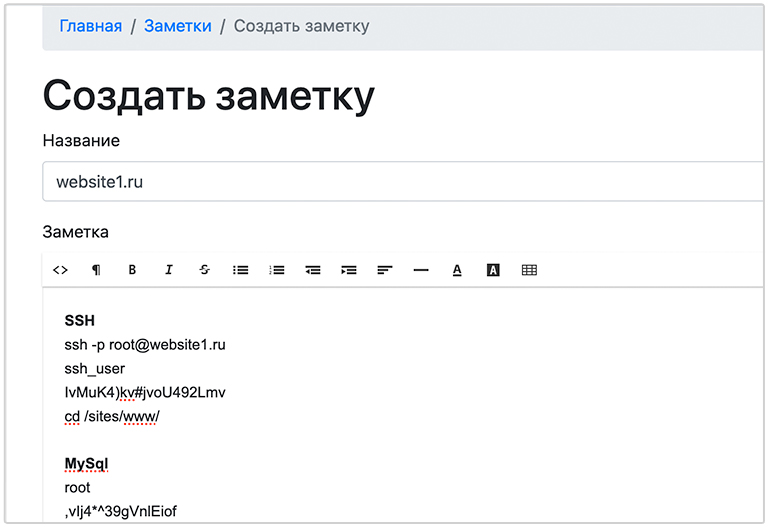 Для того, чтобы заметки были удобочитаемыми, предоставляется простой, но мощный html-редактор со всеми основными популярными функциями и тэгами — от формата текста полужирным и курсивом до таблиц и списков с возможностью поправить исходный html-код заметок.