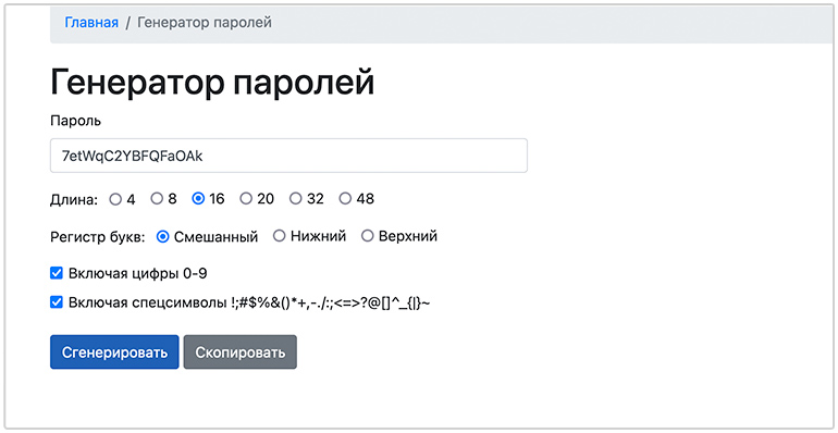 Для создания криптостойких паролей предоставляется генератор паролей с набором букв, цифр и специальных символов с различной длиной паролей и возможностью выбора регистра букв.